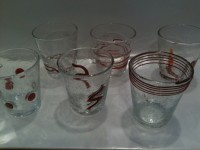 Bicchieri vetro trasparente con 6 decori color rosso in soggetti diversi